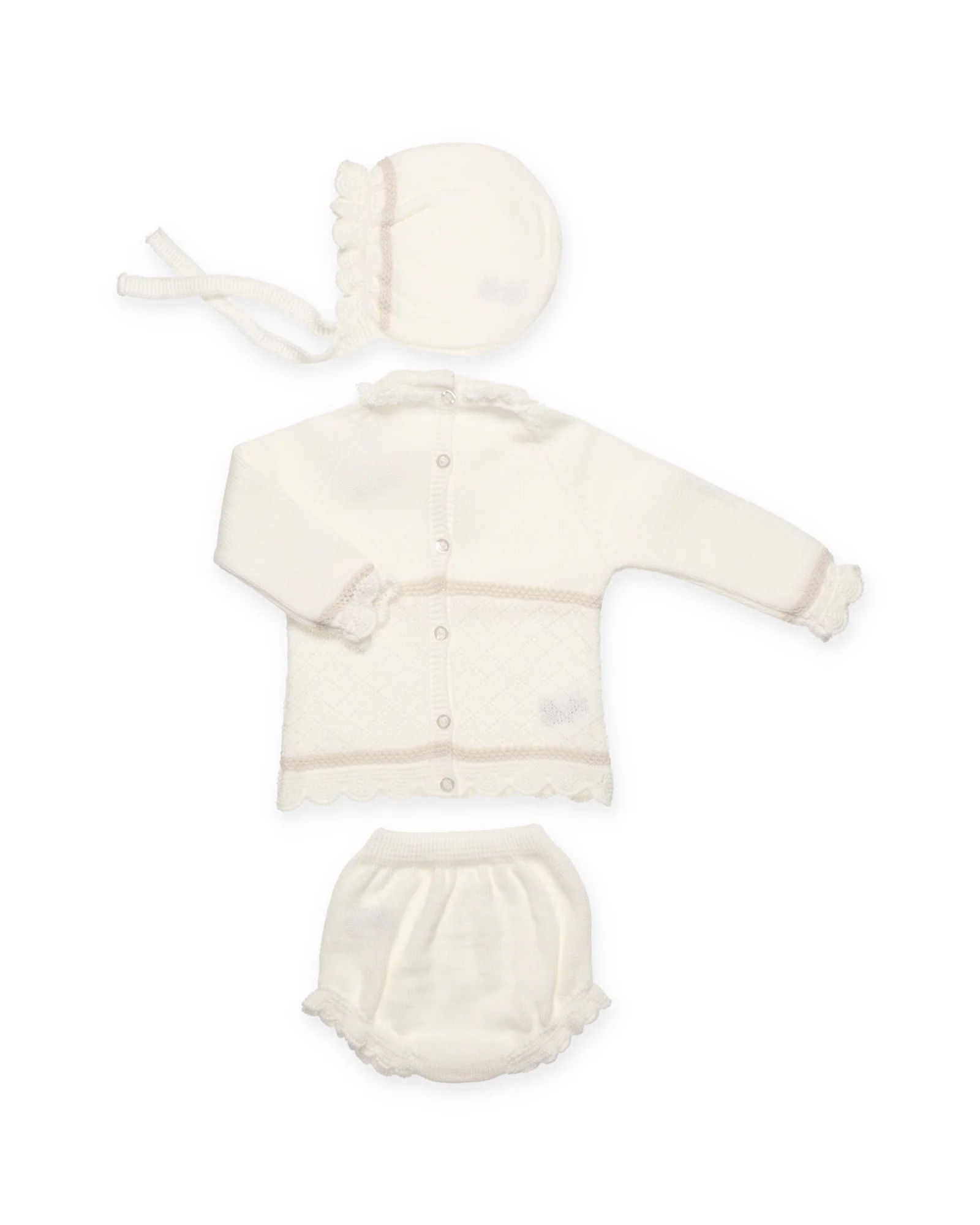 Jersey con dibujo de rombos y remate de vastas en bajo y puños. Ranita lisa y gorro a conjunto.