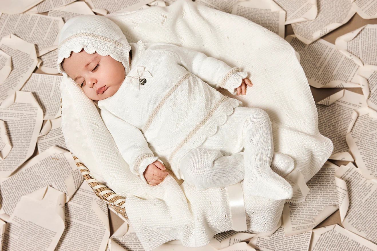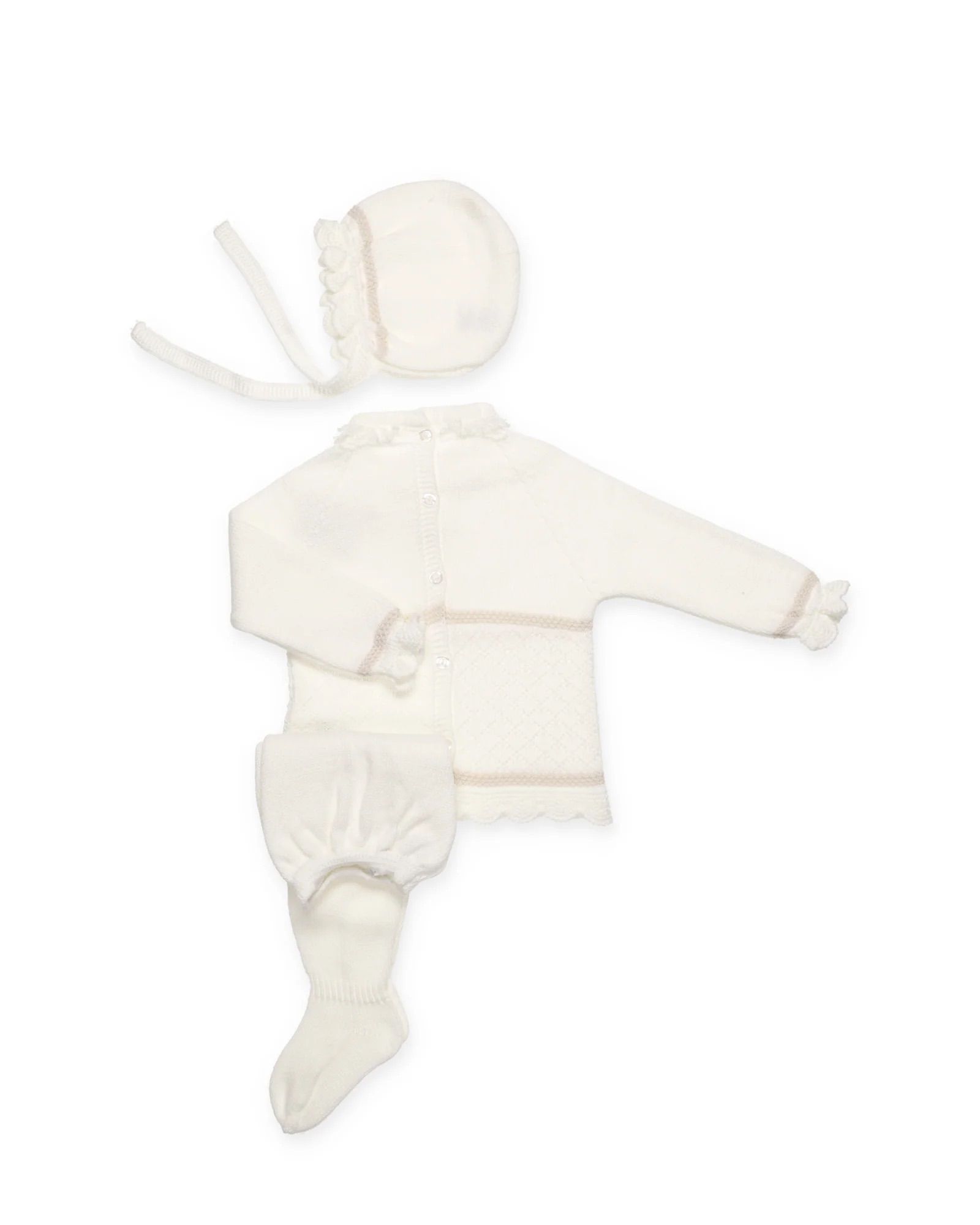 Jersey de punto rayado con trenzas decorativas. Cuello redondo adornado con puntilla de punto y pequeño lazo central con charm metálico.Puños con volante fruncido y cenefa decorativa en contraste, igual que en el bajo.Cierre en la espalda con botones. Polaina a tono y gorro de punto liso incluido.