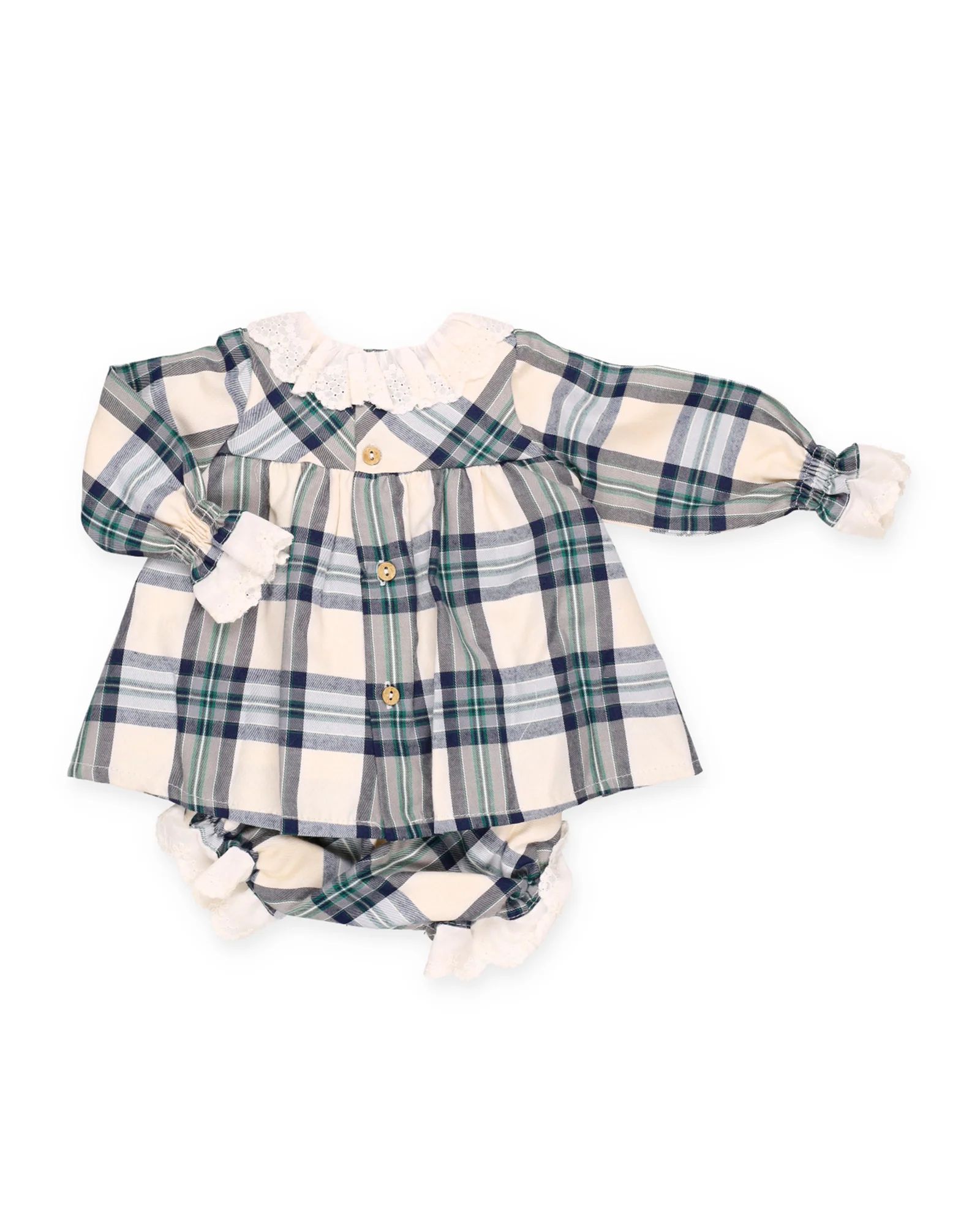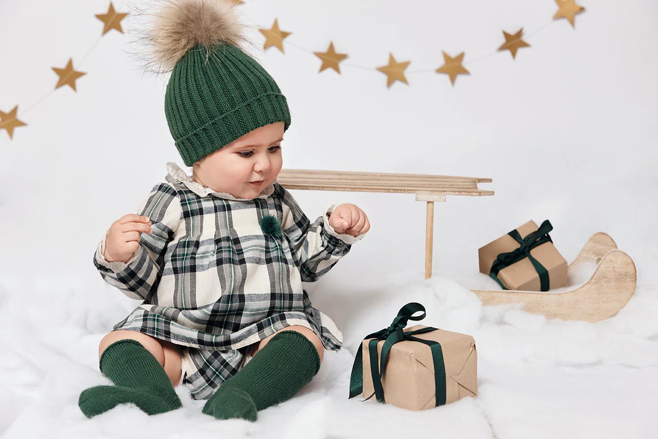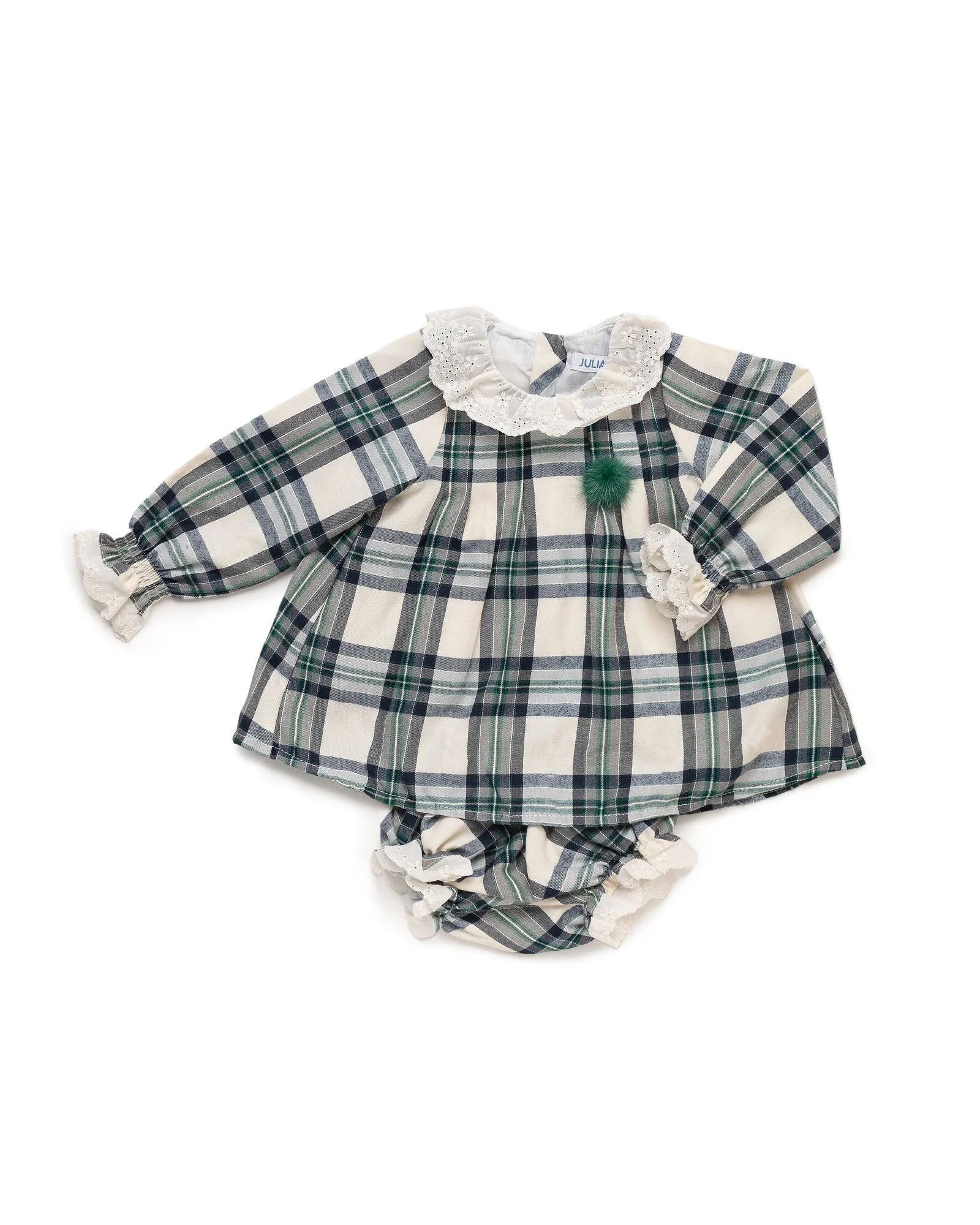 Jesusito con estampado de cuadros en tonos verde musgo, marino y crudo, con cuello de puntilla blanca y delicadas gomas en las mangas con volante. El pompón de pelo verde aporta un toque de alegría invernal. Incluye ranita a conjunto con detalle de volantes.